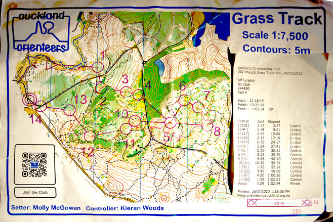 Hur gick det då för ULF på den några hundratals deltagare stora orienteringstävlingen i Muriwaiskogarna 45 min bilresa hemifrån? Denna gång släppte de glada arrangörerna ut honom på en kort, men fysiskt och orienteringstekniskt mycket krävande bana. De första två kilometrarna klättrade han mestadels på alla fyra uppför nästan 250 höjdmetrar. Det var en tät bush med en svårforcerad undervegetation och nästan meterhöga gräsrevstuvor som slingrade sig fast kring benen. Kontrollerna var oftast synliga först när man klev på dem. Men på något sätt tog ULF sig ändå runt och det blev bara några minuters missar, innan han kunde göra sin slutspurt mot målet där Ida hejade på. De andra startande visade sig ha haft ännu tuffare uppgörelser med svårigheterna och ULF var förvånad etta. Ingen träningsvärk efteråt, så kanske har det nu lossnat!?